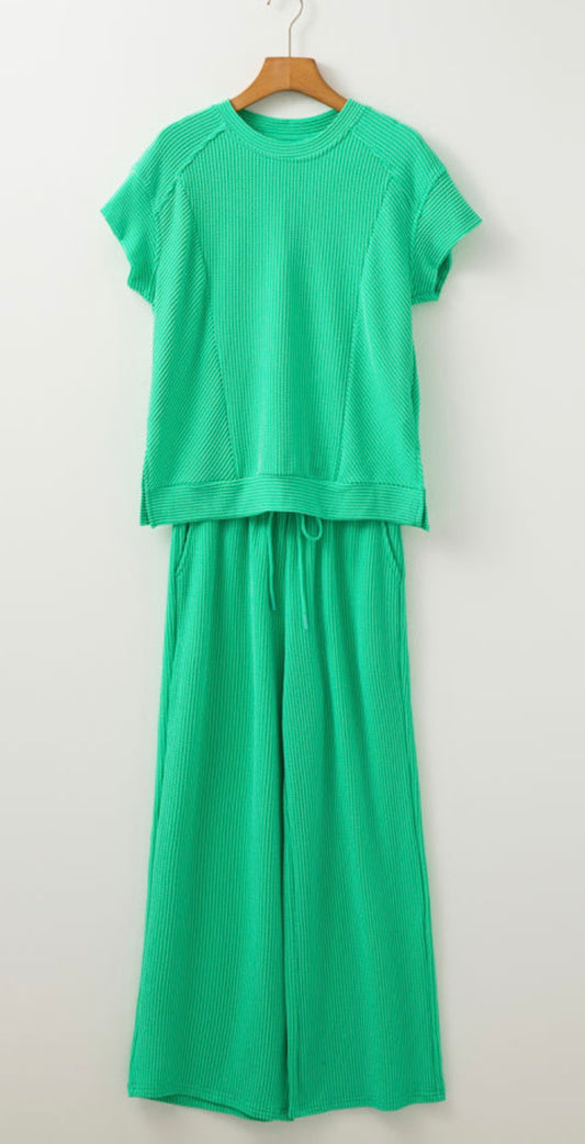 Corded Knit Short Sleeve T-shirt/ Wide Leg Pants Set